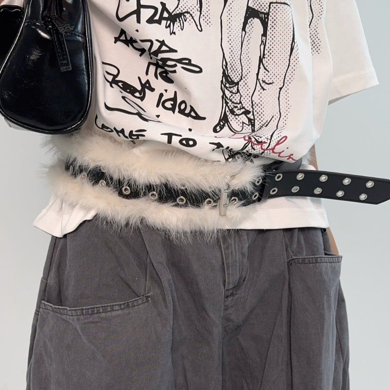 Faux Fur & PU Leather Wide Belt for Women, Baggy Jeans & Retro Coquette Style YD008